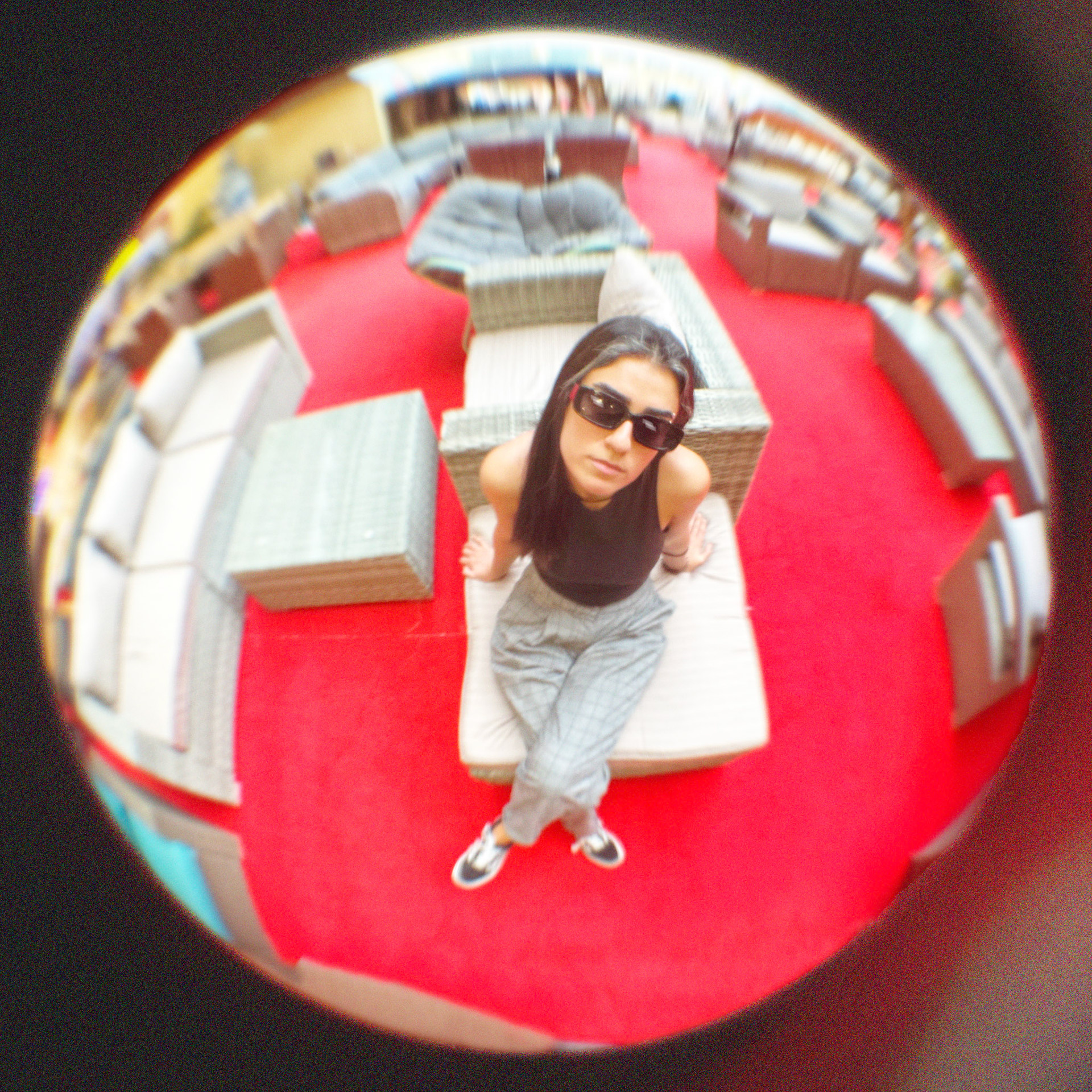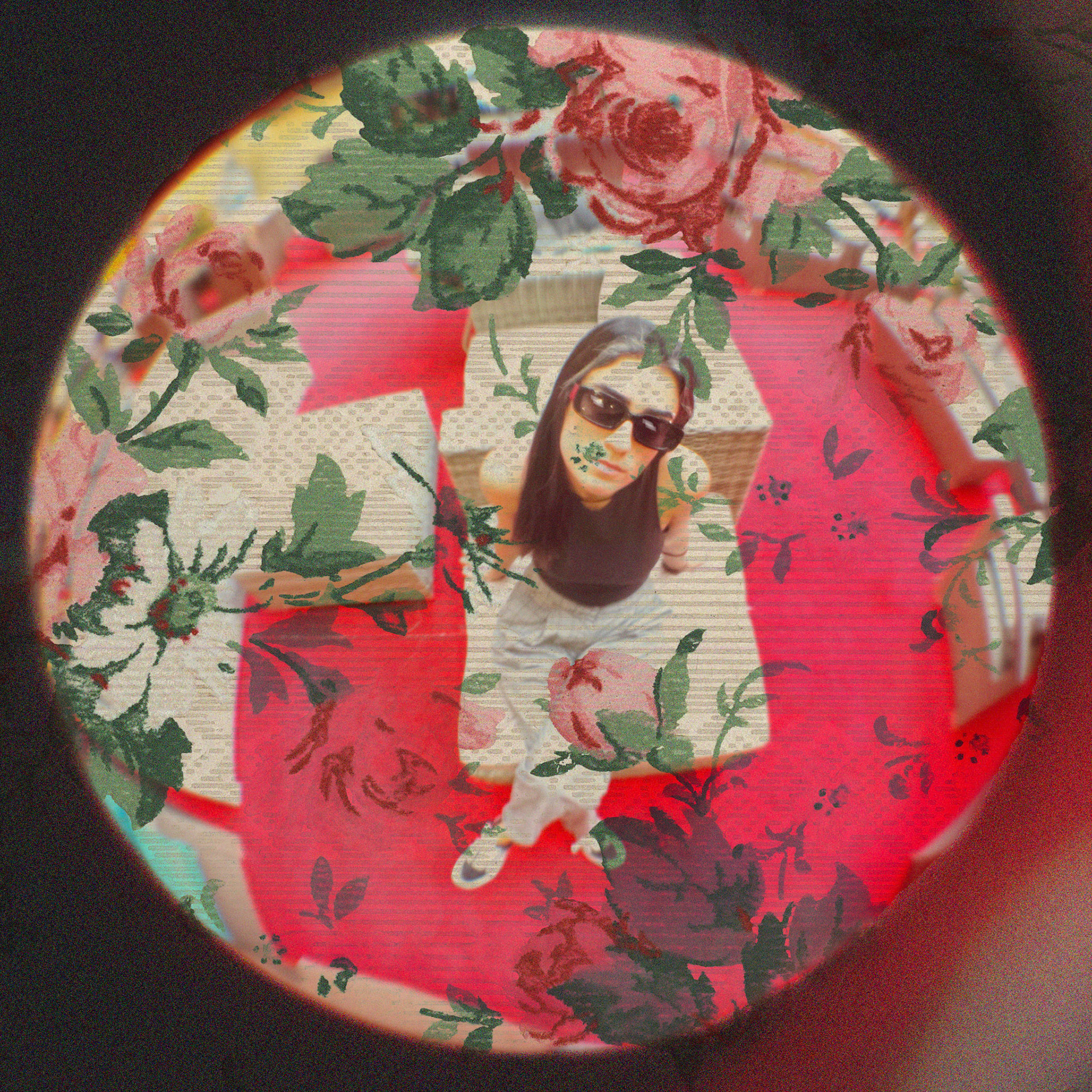 "فتحي يا وردة" is a playful edit of a fish-eye photograph using floral scan, reimagining the nostalgic children's rhyme "فتحي يا وردة".